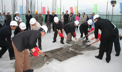 随着建设单位代表一声令下,十位嘉宾手持铁锹,顺利地把最后一斗混凝土筑入顶板结构中。火红的鞭炮也来助兴,一股喜庆洋洋的气氛随着鞭炮硝烟弥漫到整个顶楼的上空。至此,城市山谷花园主体结构施工顺利实现封顶。
