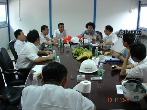 绿海名居工程于七月初申报了2006年度下半年深圳市优质结构工程奖。7月10日,由深圳建筑业协会有关专家组成的检查小组莅临该工地进行第一次检查,此次主要检查钢筋和模板。检查小组对现场所见表达了一致的肯定意见。上图为检查小组在项目部会议室讲评第一次检查的情况,并提出整改意见。(☆ 周幼琼/图)