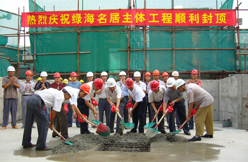 随着深圳市名居房地产有限公司黄壮雄总经理宣布:“绿海名居主体工程正式封顶。”开发单位、监理单位和我司共八位领导同时挥动手中系着大红花的铁锹,在众人的掌声中为主体工程填上了最后的一方混凝土,昭示着绿海名居主体工程顺利封顶。封顶仪式圆满完成后,出席仪式的领导们还一同到各楼层参观,察看工程施工情况。