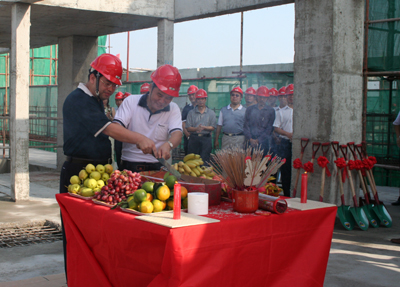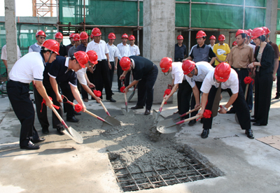 简单的切烧猪拜神仪式举行过后,我集团公司董事长黄世豪、开发单位鸿隆实业有限公司董事长曾云枢等十位领导和嘉宾纷纷挥锹铲土,在众人的掌声中为主体工程填上了最后的一方混凝土,昭示着鸿隆广场项目顺利封顶。