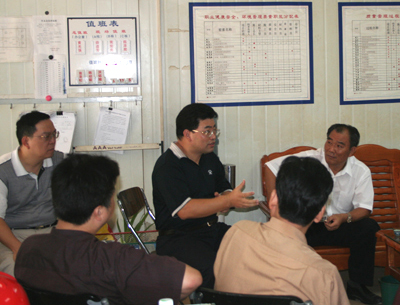 洪总与集团公司领导在项目部办公室交流施工经验 (周幼琼摄)