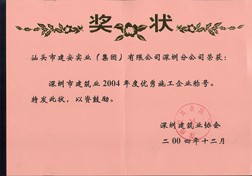 烈祝贺我司荣获“深圳市建筑业2004年度优秀施工企业”称号,洪树华同志荣获“深圳市建筑业2004年度优秀施工企业家”称号