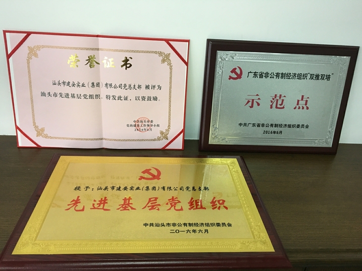 “七一”前夕,在全体党员的共同努力下,我司党总支部喜获多项荣誉,被授予“广东省非公经济组织党委‘双推双培’示范点”、“汕头市先进基层党组织”、“汕头市非公经济组织党委先进基层党组织”荣誉称号。